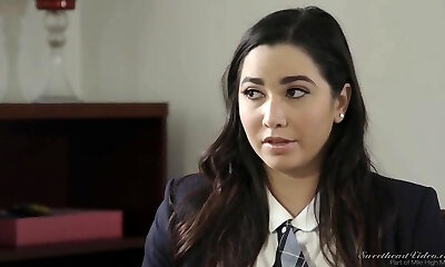 Obscene sexy coed gal in uniform Mia kisses schoolteacher and gets poked on the desk