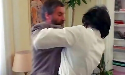 Greenhorn fucks two mature lesbians in the office and they enjoy cum swapping