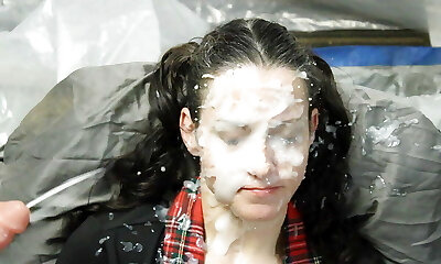 une fille aux cheveux noirs se fait éjaculer sur le visage après avoir sucé une bite et se faire pénétrer
