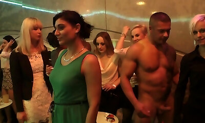 Mischievous chicks take turns at playing with stiffys at the party
